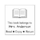 Une image d'un livre ouvert est au-dessus du texte. La première ligne dit que ce livre appartient à. La ligne suivante peut être changée en nom de l'enseignant. La dernière ligne dit Read Enjoy Return. Les étoiles sont entre les mots sur le fond.