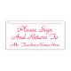 Cette conception respectable d'estampille en caoutchouc comporte le message "Veuillez signer et retourner à", ainsi qu'une ligne pour une signature ou des initiales à écrire ci-dessus. Il porte également le nom d’un enseignant customisé. Il pourrait être utilisé par un enseignant, un éducateur ou un tuteur pour demander aux parents ou tuteurs d’un étudiant de se pencher sur le travail de l’étudiant sur un projet, un examen, un document ou une autre affectation scolaire.