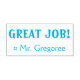 Ce design de timbres en caoutchouc encourageant comporte le message encourageant "GRAND TRAVAIL !" et un nom d'enseignant personnalisé. Il pourrait être utilisé par un enseignant, un éducateur ou un tuteur pour évaluer le travail des étudiants, pour reconnaître qu'un étudiant a fait un travail exceptionnel.