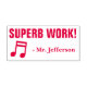 Ce design de timbres en caoutchouc motivant comprend le message "SUPERB WORK!" et le nom d'un éducateur personnalisé. Il présente également une note musicale décorative. Il pourrait être utilisé par un enseignant ou un éducateur pour marquer les affectations, pour reconnaître que l'étudiant a bien fait.