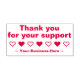 Ce design d'estampille en caoutchouc comprend le message reconnaissant "Merci pour votre support" et un nom d'entreprise personnalisable. Il est également décoré en forme de coeur. Il peut être utilisé par une entreprise, une entreprise, une organisation ou un professionnel pour exprimer sa gratitude aux clients ou aux clients pour leur entreprise.