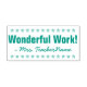 Cette conception amusante de timbres en caoutchouc comprend le message de rétroaction motivationnelle "Merveilleux travail!" et le nom d'un éducateur personnalisé. Il présente également un contour décoratif étoilé. Il pourrait être utilisé par un enseignant, un éducateur ou un tuteur de l'école pour marquer les affectations, pour reconnaître que l'élève a bien fait.