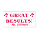 Ce design de timbres en caoutchouc encourageant comporte le message motivant "GRANDS RÉSULTATS !" et le nom d'un tuteur customisé. Il présente également des notes de musique décoratives. Il pourrait être utilisé par un enseignant, un éducateur ou un tuteur pour marquer les affectations, pour reconnaître que l'étudiant a bien fait.