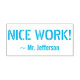 Ce design amusant de timbres en caoutchouc comprend le message "NICE WORK!" et le nom d'un éducateur customisé. Il pourrait être utilisé par un enseignant, un éducateur ou un tuteur pour marquer les affectations, pour reconnaître que l'étudiant a bien fait.