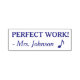 Ce design de timbres en caoutchouc encourageant comporte le message encourageant "PARFAIT TRAVAIL !" et le nom d'un éducateur customisé. Il présente également une note musicale décorative. Il pourrait être utilisé par un enseignant ou un éducateur pour marquer les affectations, pour reconnaître que l'étudiant a fait un excellent travail.