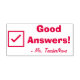Ce design amusant de timbres en caoutchouc comprend le message de louange "Bonne réponse !" et le nom d'un enseignant ou d'un éducateur personnalisé. Il dispose également d'une icône de coche décorative. Il pourrait être utilisé par un enseignant, un éducateur, un instructeur ou un tuteur pour marquer les affectations, pour indiquer qu'un étudiant a bien fait.