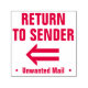 Ce cachet en caoutchouc comprend les messages "RETOURNER À L'ENVOI" et "⬩ E-mail indésirable ⬩", ainsi qu'un symbole de flèche décorative. Il peut être utilisé pour indiquer que le courrier reçu a été livré à la mauvaise adresse et doit être retourné à l'expéditeur.