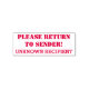 Ce design d'estampille comporte les messages "Please Return To Sender !" et "UNKNOWN RECIPIENT". Il peut être utilisé pour indiquer que le courrier reçu a été livré à la mauvaise adresse et doit être retourné à l'expéditeur.