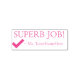 Cette conception amusante de timbres en caoutchouc comprend le message de rétroaction positive "SUPERB JOB!" et un nom d'éducateur personnalisé. Il est également doté d'une coche décorative. Il pourrait être utilisé par un enseignant, un éducateur ou un tuteur pour marquer les affectations, pour indiquer que l'étudiant a fait un excellent travail.