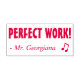Ce design amusant de timbres en caoutchouc comprend le message motivant "PARFAIT TRAVAIL !" et le nom d'un éducateur customisé. Il présente également une note musicale décorative. Il pourrait être utilisé par un enseignant ou un éducateur pour marquer les affectations, pour reconnaître que l'étudiant a bien fait.