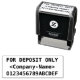 Cette simple estampille en caoutchouc comporte le message "POUR DÉPÔT SEULEMENT", ainsi qu'un nom personnel/commercial et un numéro de compte personnalisés. Il pourrait être utilisé par un employé de bureau, un employé de bureau ou un particulier pour ajouter efficacement une approbation restrictive à un chèque.