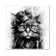 A fierce looking dark gray and black pussy cat wearing a leather hat with steampunk brass on it. A bronze feather tops the cock-eyed hat. This beautiful feline is wearing a golden or amber lensed monocle giving one eye a bronze tone, Around the cats neck hangs a brass trinket of some kind adding to the overall Steampunk attire.