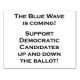 "LA VAGUE BLEUE VIENT. SOUTENIR LES CANDIDATS DÉMOCRATIQUES À LA HAUTEUR ET À LA BALLE !" par Monkey Business Graphic Design, 2024.