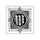 Lettre M première lettre de style gothique vintage calligraphie dessinée à la main. La lettre M est centrée dans un cadre circulaire et un cadre extérieur carré. Bordée de vagues, de points et de lignes décoratives.