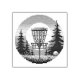 Illustration d'un parcours de golf à disques avec panier, pins et couché de soleil dans un style de vibes de jeu d'art 8 bits.
