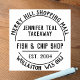 Timbre en caoutchouc à emporter. Poisson & Chip Shop Timbre en caoutchouc. Nom de l'entreprise, type d'entreprise, plus deux lignes d'adresse dans un effet circulaire. Un tampon d'affaires Fish & Chip Shop toutes sortes d'articles de papeterie, enveloppes, paquets etc. Timez votre adresse de retour facilement et élégamment. Poisson et frites estampille.
