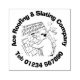 Compagnie de toiture avec un homme travaillant sur les ardoises. Illustration amusante de réparation de toits de dessin animé. Personnalisez avec votre choix de nom d'entreprise et de numéro de contact. Timbre en caoutchouc du toit avec les détails de votre entreprise à imprimer sur la papeterie et la paperasse de l'entreprise