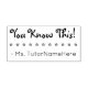 Cette conception motivante de timbres en caoutchouc comprend le message de rétroaction positive "You Know This!" et le nom d'un tuteur personnalisé. Il présente également un contour décoratif étoilé. Il pourrait être utilisé par un enseignant ou un éducateur pour évaluer le travail des étudiants, pour reconnaître qu'un étudiant a fait un travail exceptionnel.