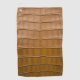 A close-up photograph of crocodile leather texture in warm brown tones. The leather has a distinct scale pattern with prominent rectangular plates arranged in horizontal rows. The scales have a subtle gradient from a lighter tan colour on top to a deeper golden brown at the bottom. The texture shows fine details of the natural creases and ridges between each scale. The leather has a smooth, polished finish that creates subtle shadows in the valleys between the scales. The pattern is symmetrical and fills the entire frame. The lighting is even across the surface, highlighting the natural sheen of the material. The image captures the luxurious, premium quality of high-end leather goods.