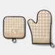 Tan And White Gingham Plaid Chequered Monogrammed Oven Mitt & Pot Holder Set