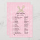 A tan bunny rabbit above game title with pink diamond argyle background. Templates created for you. This is a Baby Candy baby shower game.