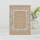 This design features a warm earth-toned background providing a beautiful foundation for the floral elements. Delicate sprigs of purple lilacs and soft green eucalyptus leaves are layered around the centre. Intricate white lace-like detailing adds a touch of vintage elegance. Perfect for a rustic outdoor event, the colour palette combines tan, lavender, and sage green.