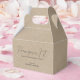 Hangover kit wedding favour box, whimsical minimalistic modern, customizable white script typography. The tan colour printed linen texture background adds a touch of an organic feel and classic elegance. Other colours are available.