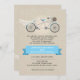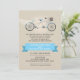 Bicycle-themed weddings are a fun trend in themed weddings. On this faux linen background wedding invitation, a tandem bicycle symbolizes the married couple-to-be riding off together. The bride's seat has a wedding veil wrapped around it and the groom's seat has an untied bow tie wrapped around the handlebars. A bridal bouquet is placed in the bike's basket. The couple's names stand out in a sky blue banner on the front and back. Available in alternate banner colours with a option for bride's and groom's bike.
