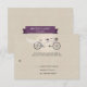 Bicycle-themed weddings are a fun trend in themed weddings. On this faux linen background reply card, a purple tandem bicycle symbolizes the married couple-to-be riding off together. The bride's seat has a wedding veil wrapped around it and the groom's seat has an untied bow tie wrapped around the handlebars. A bridal bouquet is placed in the bike's basket. Customized reply information prints below. The couple's names stand out in a plum coloured banner on the back with their names and event date standing out. Available in alternate colours with a option for bride's and groom's bike.