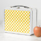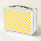 Tangerine yellow and white chequerboard metal lunch box