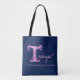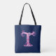 Pretty hand drawn T monogram name and meaning bag design. Ideal for a personalized gift for a girl who has a name beginning with T. This example reads Tanya A royal beauty, striking, defiant & mystical or you can customize the text with your own name and meaning words if required. Background colour currently dark blue but you can also change this to your own choice of colour if required. Ideal as a special birthday or celebration gift. If you need help with your own personalized name please contact me. Capital letter T typographical hearts and flowers drawing and graphic conversion in shades of bright pink and purple © unique art text and design by Sarah Trett. www.sarahtrett.com for www.mylittleeden.com