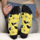 These fun socks are perfect for tap dancers and dance instructors. They feature a pattern of tap shoes in black and grey with black starburst or asterisk shapes set against a sunny yellow gold background.