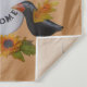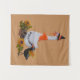 Goose with "Welcome" across lower body, is dressed in Conical hat with orange ribbon and scarf around neck. Black crow is walking behind. Both are strolling across sunflowers and acorns in the path.