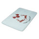 Un tapis de bain qui dit "Joyeux Noël" en texte courbe. Conçu avec une illustration de 2 cerfs de Noël sautant. Les cerfs sont faits de sériole rouge et noire, avec un peu de coeur entre eux. Les décorations de Noël en plaid rouge et noir sont accrochées au sommet. Arrière - plan bleu clair.