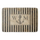 Ce tapis de bain monogramme nautique est orné d'un arrière - plan rayé noir et beige avec une ancre noire au centre et une superposition de carte du monde. Personnalisez le monogramme avec vos propres initiales. Conçu par l'artiste mondialement connu Tim Coffey.