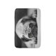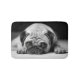 Photographie noire et blanche d'un petit carlin très adorable avec les oreilles veloutées et les yeux bruns émouvants.