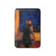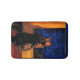 Ce tapis de bain est composé d'un magnifique chat tortue doré, orange et marron assis sur un coussin rouge, regardant par la fenêtre dans un ciel bleu nuit. Elle jette une ombre sur le rebord de fenêtre en bois doré.