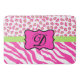Ajoutez du style à votre salle de bain, cuisine ou autre pièce avec ce tapis personnalisé avec votre monogramme initial. Ce rose et blanc chaud et ludique avec zèbre vert citron vert et motif empreinte de léopard fera un accent tendance à votre décor maison. Un emblème rose chaud fuchsia sur une bande vert citron crée une zone de personnalisation avec votre monogramme. Les rayures colorées de zèbre et les peaux de léopard ou de guépard pour le design graphique sont l'une des tendances artistiques et design les plus chaudes, et est extrêmement populaire de la mode à la décoration maison. Ce tapis est entièrement personnalisable. Allez-y avec ces modèles de peaux sauvages !