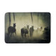 Image majestueuse de chevaux sauvages courant à travers une forêt brumeuse.