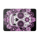 Crâne à sucre Dia de los Muertos dans les tons colorés de violet entouré de fleurs.