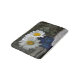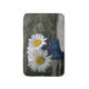 Ce tapis de bain comporte plusieurs marguerites disposées dans une vieille bouteille d'encre de cobalt, assise dans un jardin de rochers