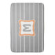 Tapis de bain de rectangle dans 3 tailles différentes. Couverture grise de salle de bains avec les rayures grises et blanches et un médaillon central pour votre initiale. Blanc, gris et orange. Assortit notre rétro ligne de Bath.