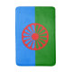 Ce dessin est orné du drapeau romani, qui est le drapeau international du peuple romani. Le drapeau est constitué d'un arrière - plan de bleu et de vert, représentant respectivement les cieux et la terre ; il contient également un chakra rouge à 16 branches, ou carrousel, au centre, qui représente la tradition itinérante du peuple romani et est aussi un hommage au drapeau de l'Inde. Le drapeau a été approuvé par les représentants de diverses communautés roms lors du premier Congrès mondial des Roms (WRC), qui s'est tenu à Orpington en 1971.
