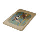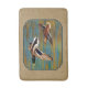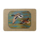 Male and female mallard ducks in flight over a golden pond, water rippling to reflect the colors of the background autumn foliage glowing in the sunlight. All on a matching earth-toned sandy brown background.