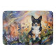 This image features a black-headed tri-colored corgi amidst a vibrant field of flowers. The artwork is rendered in a fluid alcohol ink style, creating a unique visual effect.
