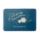 Ce tapis de bain comporte un graphique numérique inspiré par cru d'une poinsettia blanche sur un arrière - plan bleu-foncé. Le texte de manuscrit, dans une couleur de gradient d'or, lit : Joyeux Noël. Le texte personnalisable vous permet à personnaliser avec votre nom.