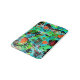 Un abstrait animé dans les tons turquoise, turquoise, orange, rouge orange, noir, blanc, or métallique et les tons verts.