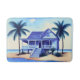 Paillote de bain dans une charmante maison de plage avec véranda, nichée entre deux grands palmiers, face à un océan serein sous un ciel clair et lumineux.