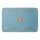 Tapis de bain monogrammed luxe tendance, exclusif à l'aspect monobloc, avec carré de parties scintillant métallique en cuivre faux or et rayures sur un arrière - plan bleu élégant. Personnalisez-le avec le nom et le monogramme initial. Il peut s'agir d'un cadeau personnel ou familial élégant et personnalisé pour un anniversaire, un ménage, une retraite, un jour férié, un anniversaire ou toute autre occasion.