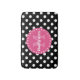 Motif à pois mignon et girly en noir et blanc avec un cadre étiquette rose tendance avec points blancs, lettre initiale monogramme personnalisée et nom personnalisé. Un cadeau élégant personnalisable pour une fille ou une femme qui aime les motifs géométriques élégants qui sont personnalisés.